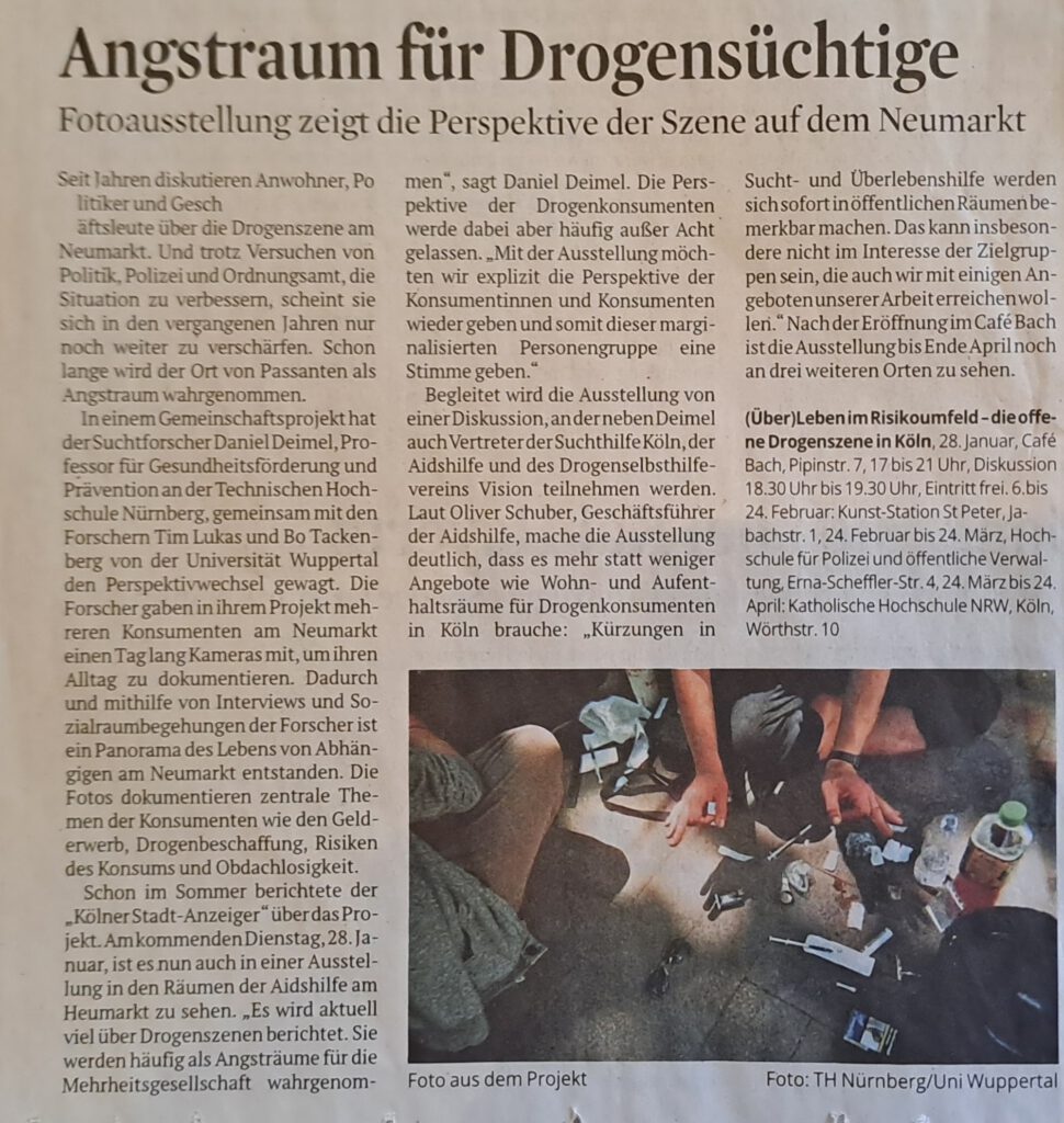 „In einem Interview mit dem „Kölner Stadt-Anzeiger“ hatte zuletzt auch der Suchtforscher Daniel Deimel betont: „Natürlich brauchen wir auch in Köln mehrere Suchthilfeeinrichtungen. Aber sie müssen erreichbar sein. Wir hatten mal einen Drogenkonsumraum im Deutzer Hafen – da waren aber weniger als zehn Leute pro Tag.“ Das war 2010. Zwei Jahre später wurde der Konsumraum wieder geschlossen, offenbar war für die schwerstabhängigen Menschen die Entfernung zum Neumarkt, wo die Szene hauptsächlich verkehrt, zu groß.“